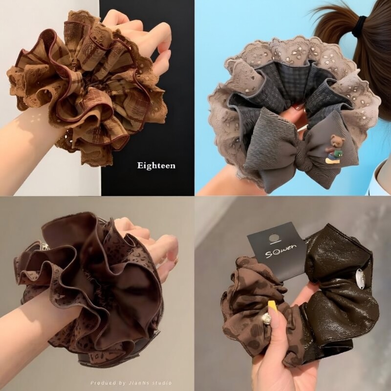 韩系重工咖色格子蕾丝四层大肠发圈皮质超大发饰气质头绳头饰格纹