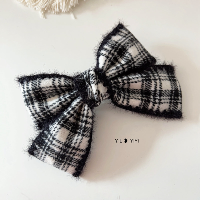 秋冬新款毛绒绒蝴蝶结发夹温暖日系格子发卡头饰韩版马尾超大发饰