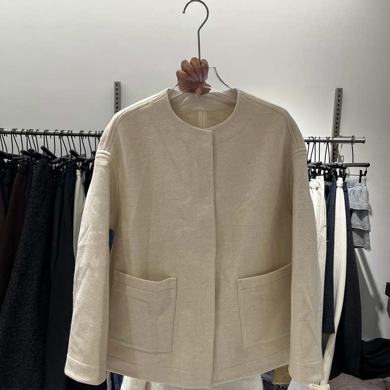 欧洲站现货2025圆领毛呢外套女短款双面呢大口袋修身大衣高品质