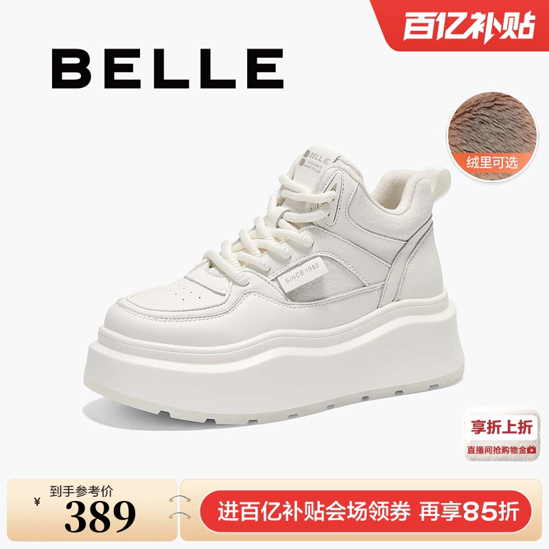 百丽女鞋子厚底高帮加绒板鞋冬季新款休闲运动小白鞋D4S1DDM4预