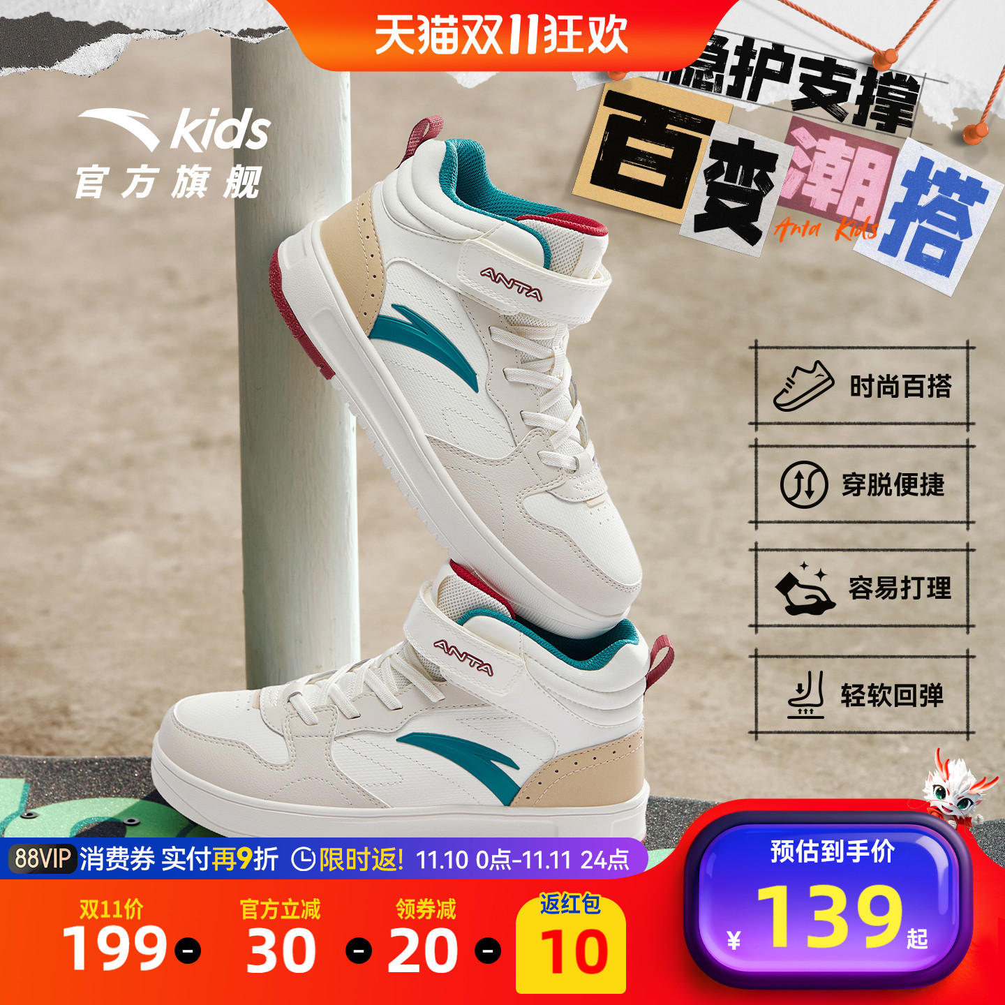 安踏儿童高帮板鞋2025春秋新款运动鞋男女童休闲鞋学生小白鞋童鞋