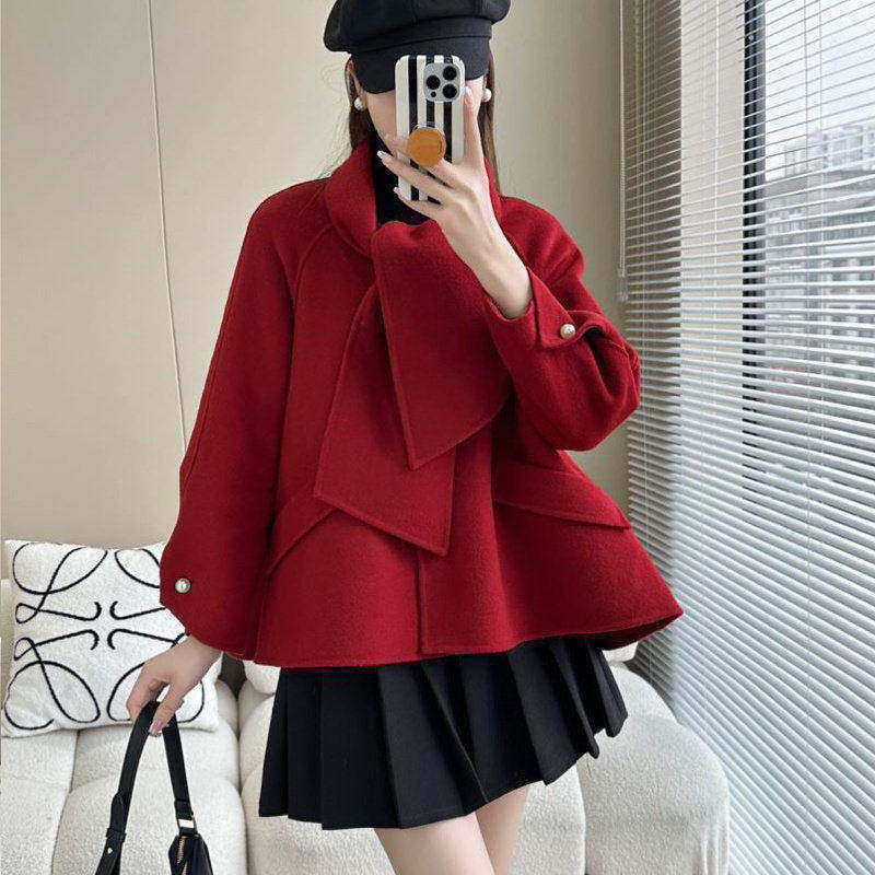 红色斗篷大衣女短款2026春秋季高级感复古宽松羊毛双面呢外套结婚