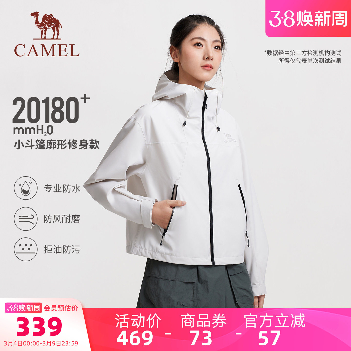 骆驼户外白色小斗篷式冲锋衣女2026春季新款防水外套短款登山服装