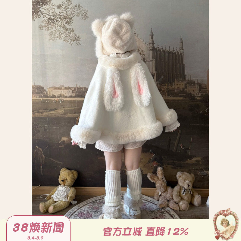 Labeau-冬日-可爱兔耳朵软糯毛绒绒短款斗篷披肩女秋冬氛围感外套