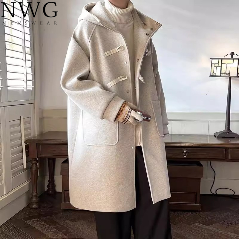 连帽毛呢大衣男潮牌秋冬款美式高级感牛角扣中长款风衣男呢子外套
