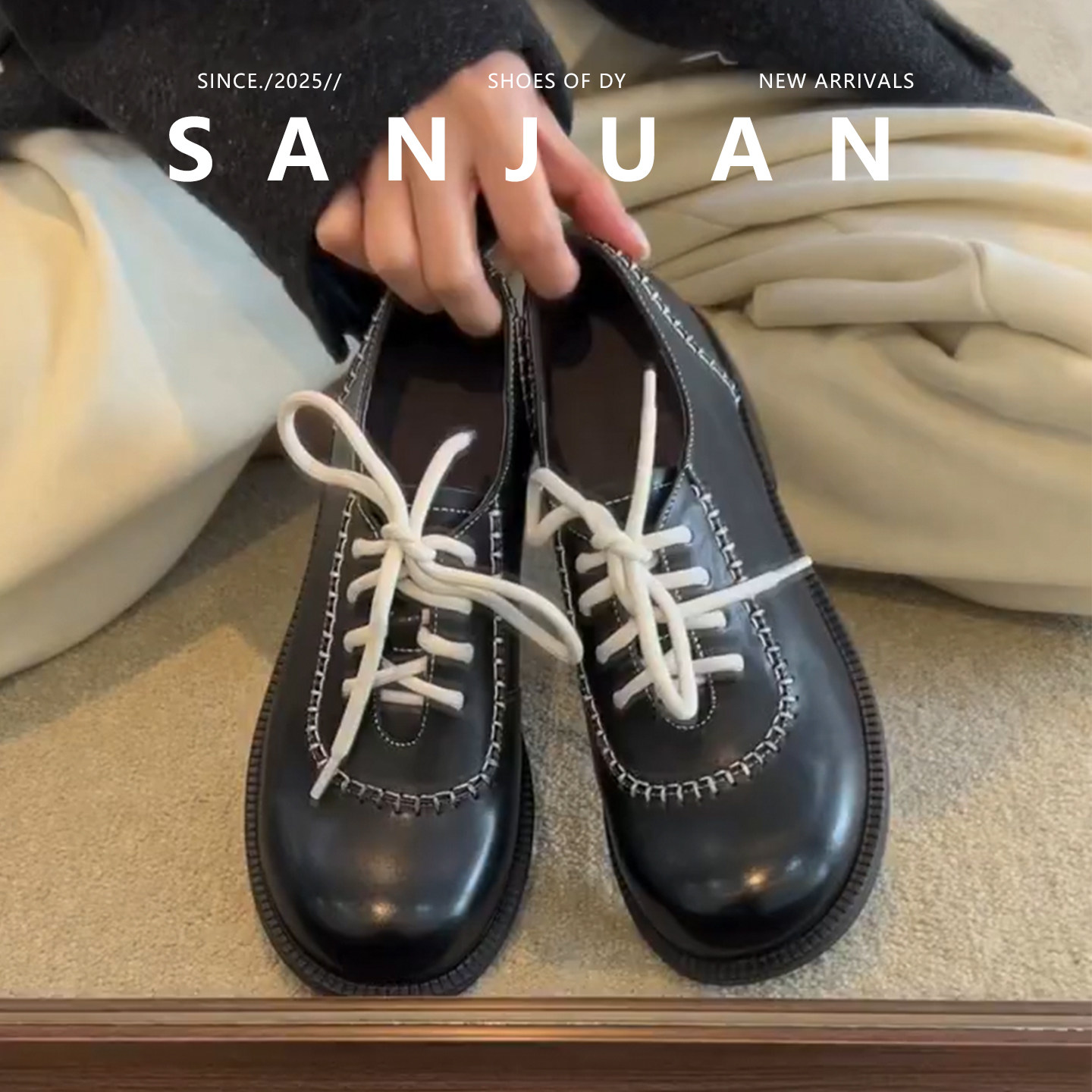 羊皮版sanjuan三卷厚底乐福鞋高跟粗跟复古学院风小皮鞋圆头单鞋