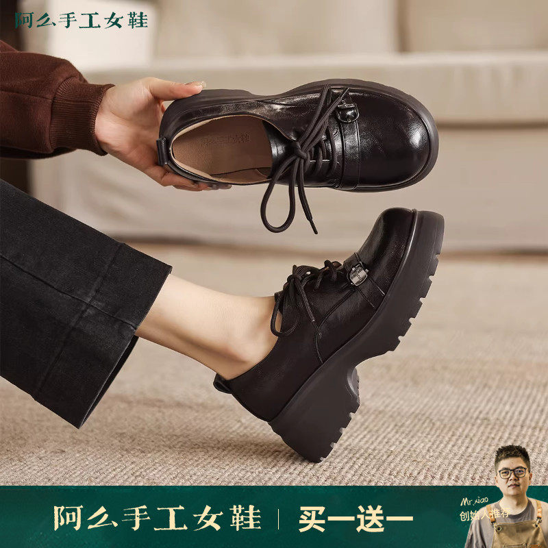 阿么手工女鞋学院风系带小皮鞋女新款百搭扣带圆头复古乐福鞋6CM