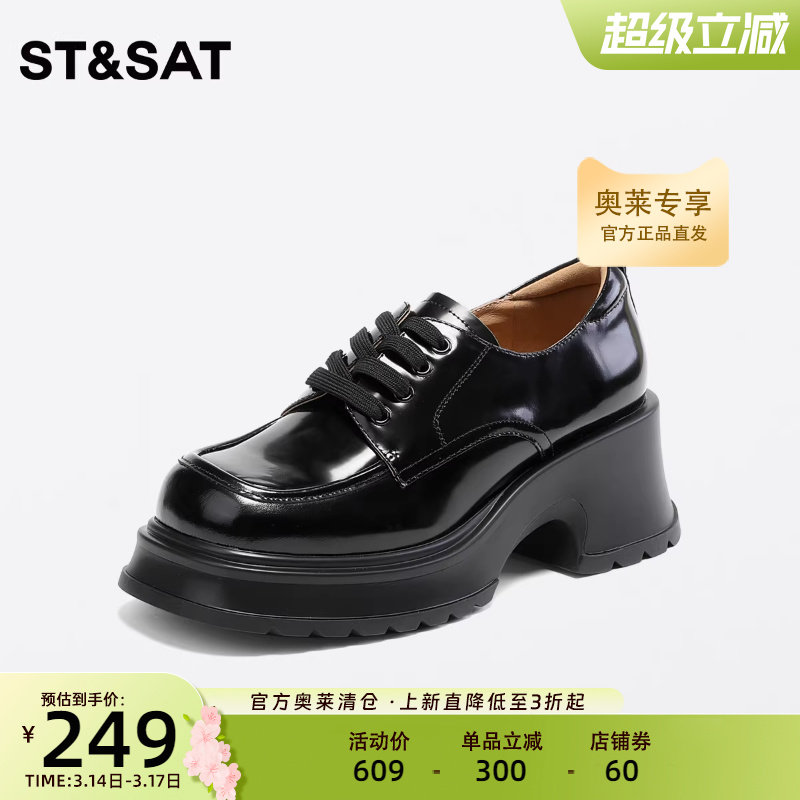 三福休闲鞋女春季学院老钱风系带小皮鞋圆头厚底女鞋834294