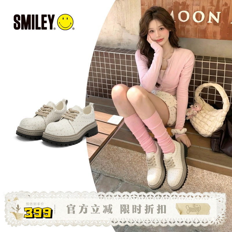 SMILEY笑脸白色波点女小皮鞋德比鞋乐福鞋增高春季圆头学院风休闲