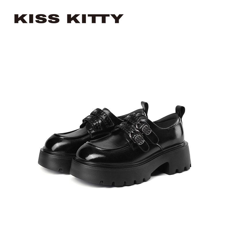 KISSKITTY学院风小皮鞋2026春季新款圆头甜酷厚底增高深口单鞋女