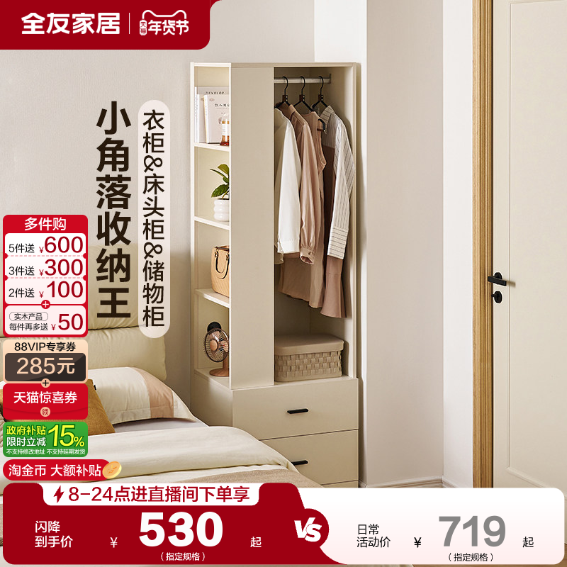 全友家居奶油风加高储物床头柜2025新款小户型卧室多功能衣帽柜