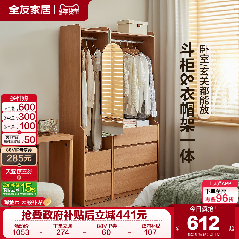 全友家居原木风衣柜家用卧室2025新款小户型省空间收纳衣橱衣帽柜
