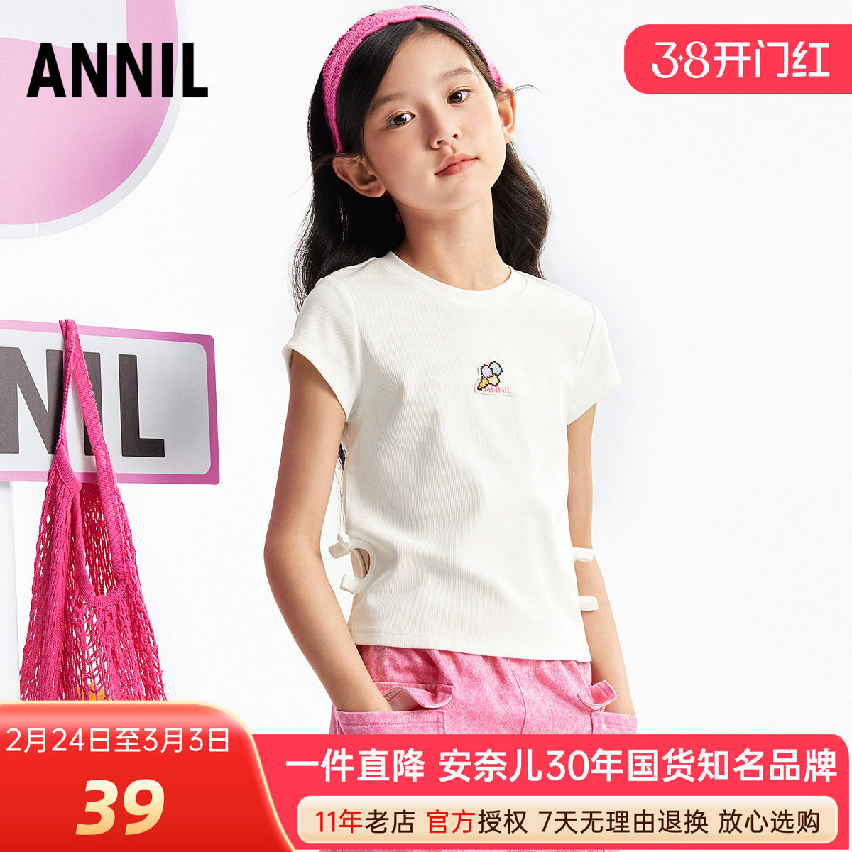 安奈儿童女童圆领短袖针织衫2025夏季新款中大儿童弹力白色T恤衫