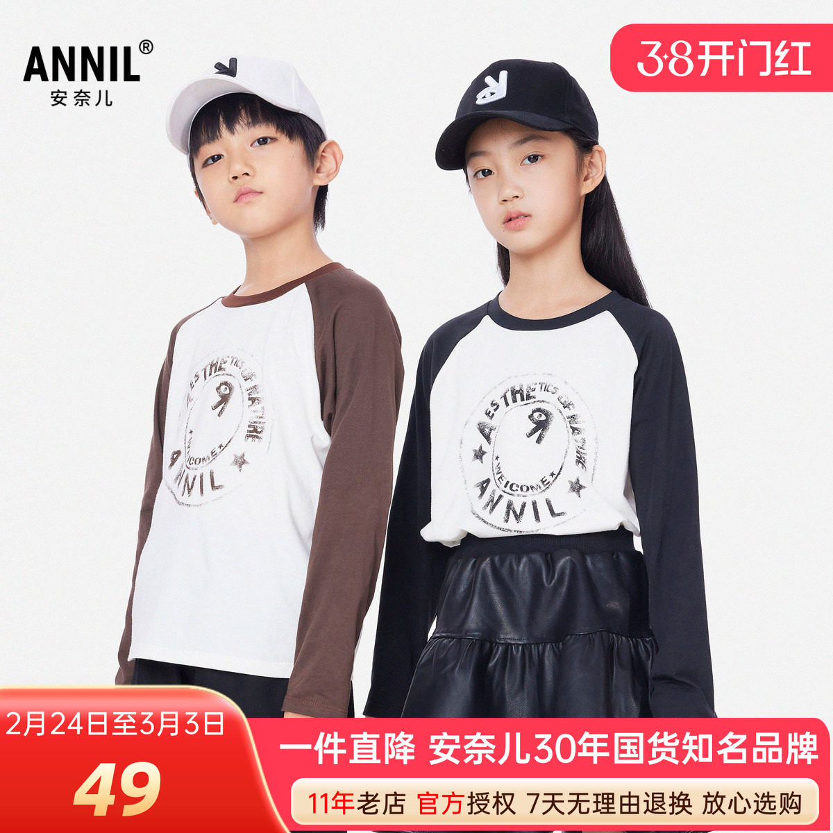 安奈儿男女童装圆领长袖针织打底衫2025秋款插肩袖休闲T恤衫透气