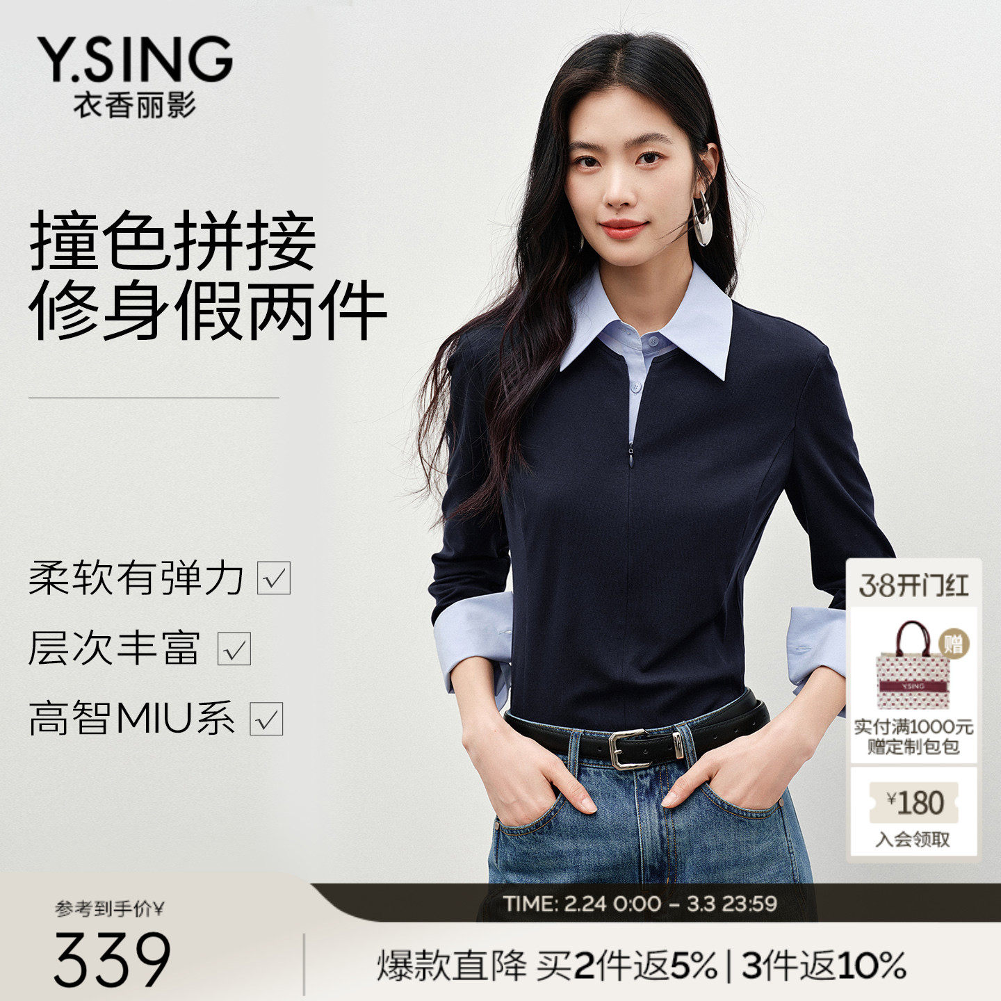 衣香丽影假两件针织衫女2026春衬衫翻领上衣miu系叠穿打底长袖T恤