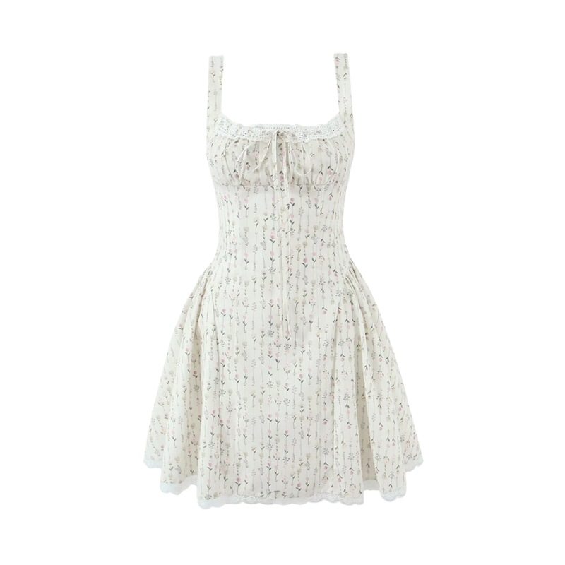 越南甜美蕾丝花边拼接吊带连衣裙女度假后背交叉镂空收腰碎花短裙