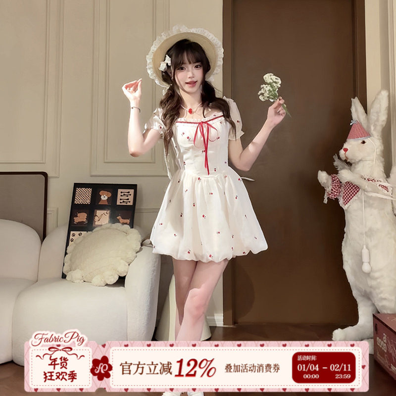 织物猪 松风茶韵 甜欲风法式白色花苞连衣裙女初夏收腰碎花短裙子