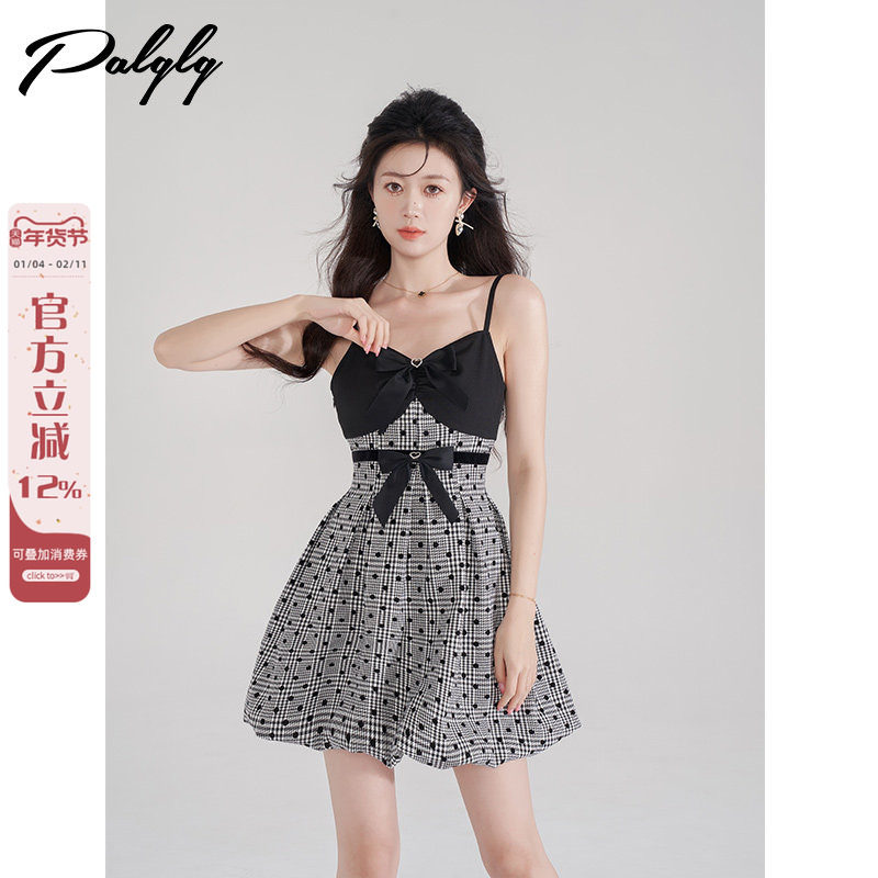 SylCue 法式辣妹风蕾丝花边显瘦V领挂脖吊带连衣裙波点印花短裙子