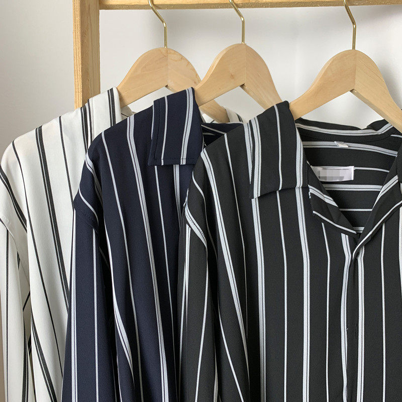 丝滑英伦西装领衬衣宽松黑白色竖条纹休闲衬衫男长袖韩版潮流帅气