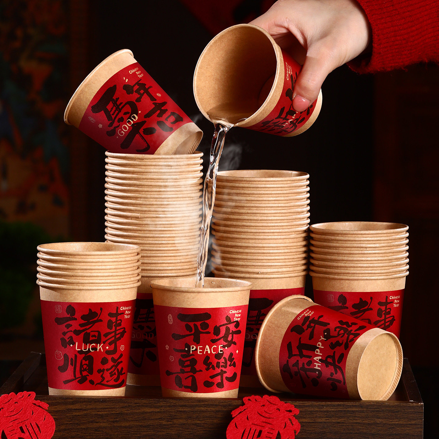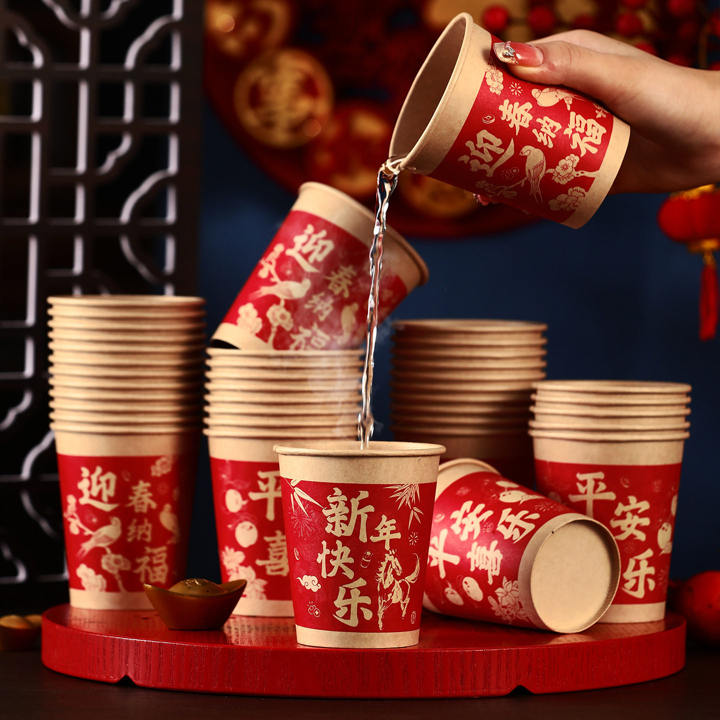 2026新年纸杯过年喜庆耐高温杯子年货马年春节家用加厚一次性水杯