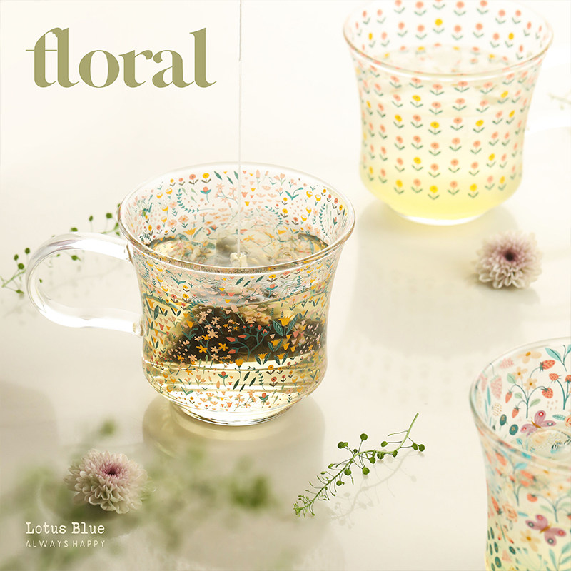 蓝莲花家居高颜值水杯高硼硅玻璃马克杯茶杯带把手家用耐高温杯子