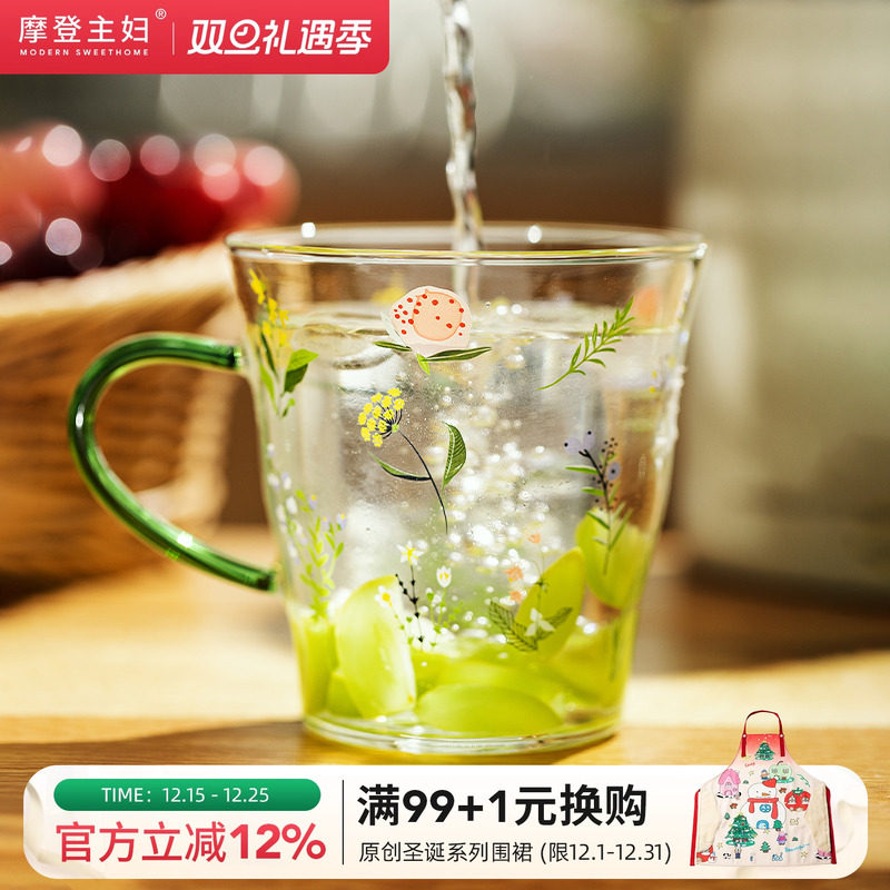 摩登主妇小枝荨高硼硅玻璃杯耐高温女生高颜值水杯家用带把手杯子