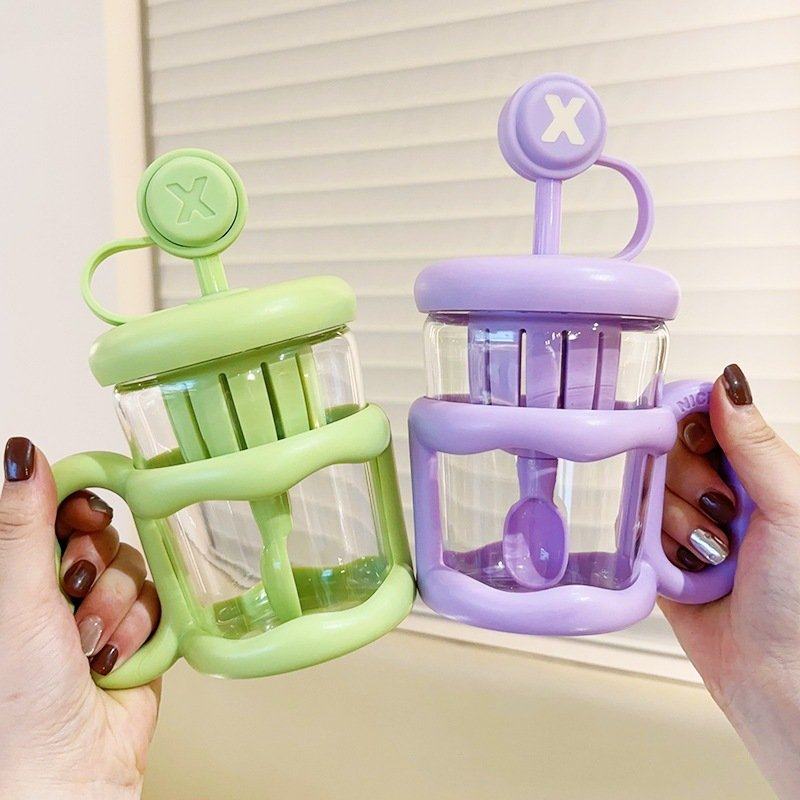 高硼硅玻璃吸管杯女高颜值办公室水杯咖啡杯带把手带盖耐高温杯子