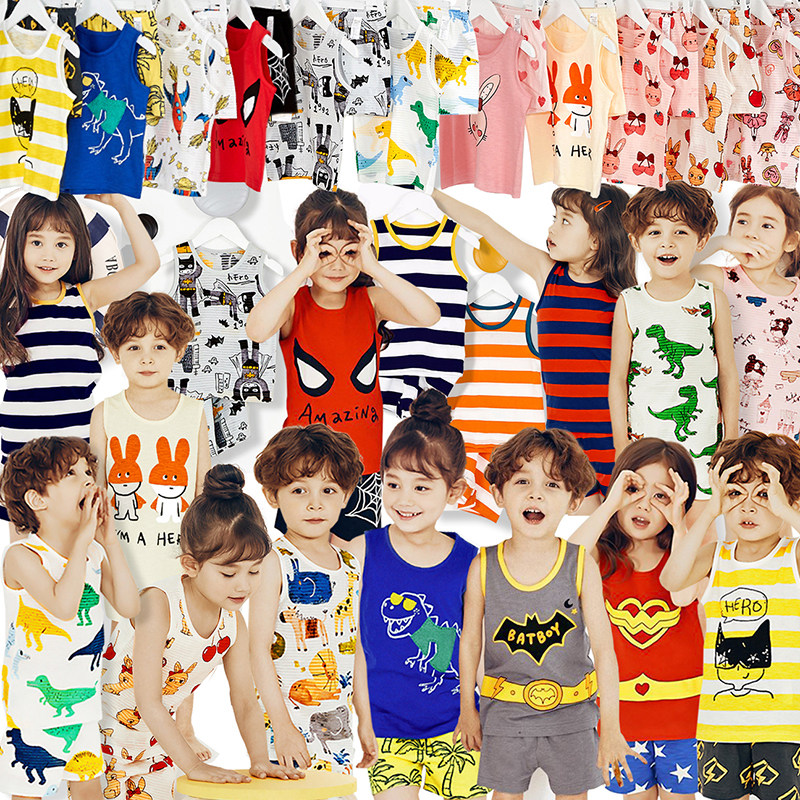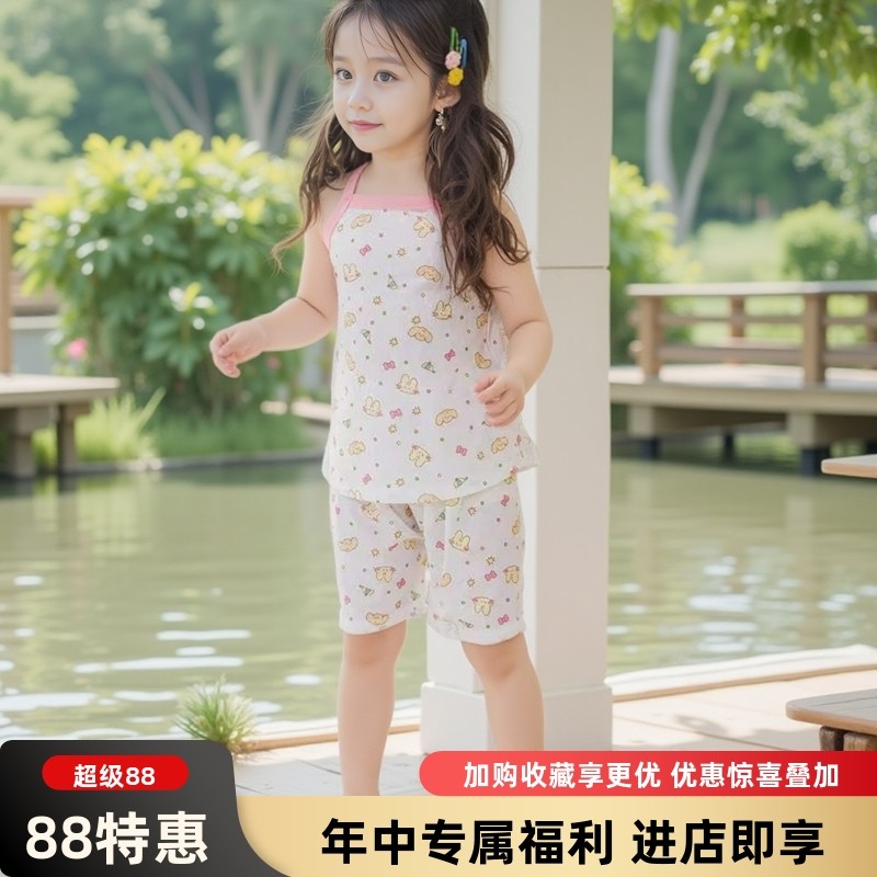 儿童新款冰丝背心短裤套装女童外出清凉吊带套装宝宝家居服空调服