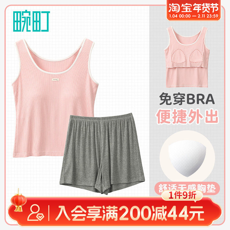 2件套夏季宽松螺纹莫代尔木耳边吊带背心短裤睡衣套装女罩杯一体