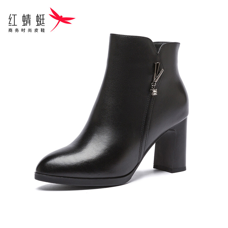 红蜻蜓高跟皮鞋女妈妈款短靴秋冬季新款女鞋羊皮加绒保暖粗跟靴子