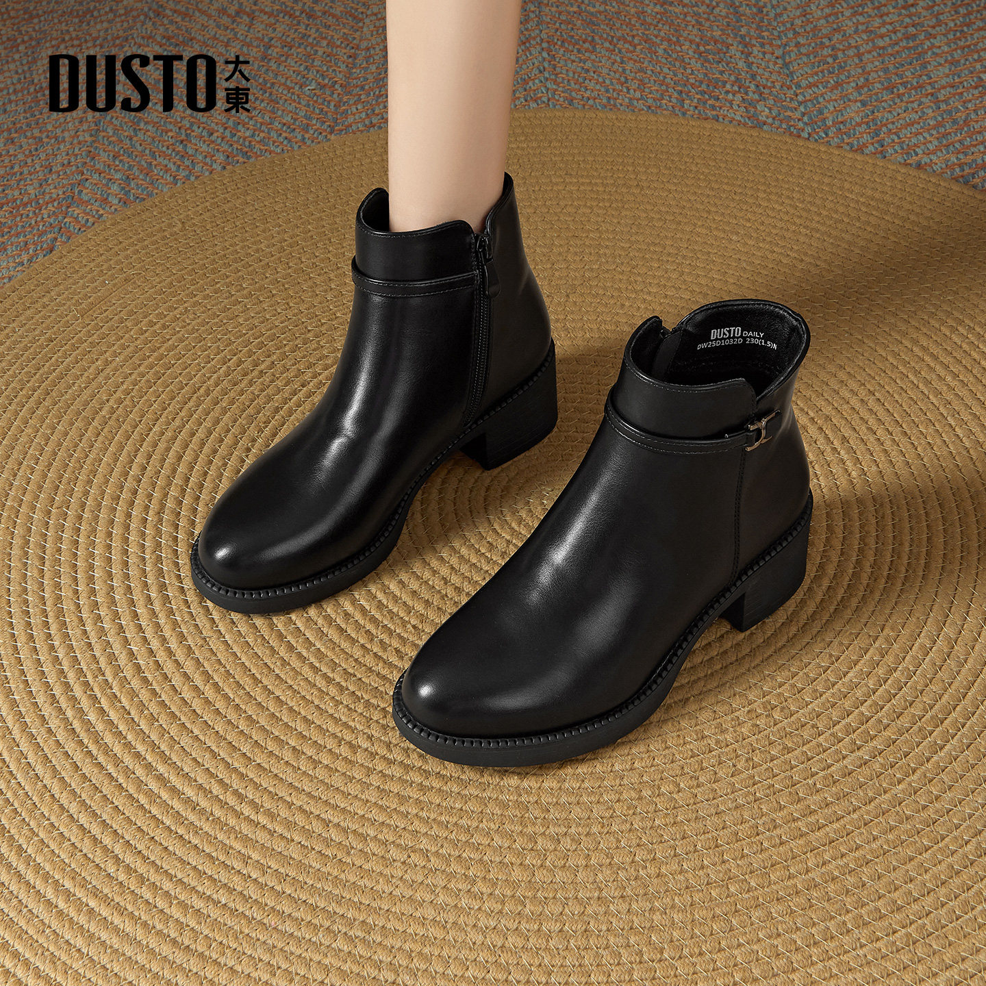 大东黑色加绒短靴女款秋冬2026新款厚底粗跟靴子女妈妈鞋女士皮靴