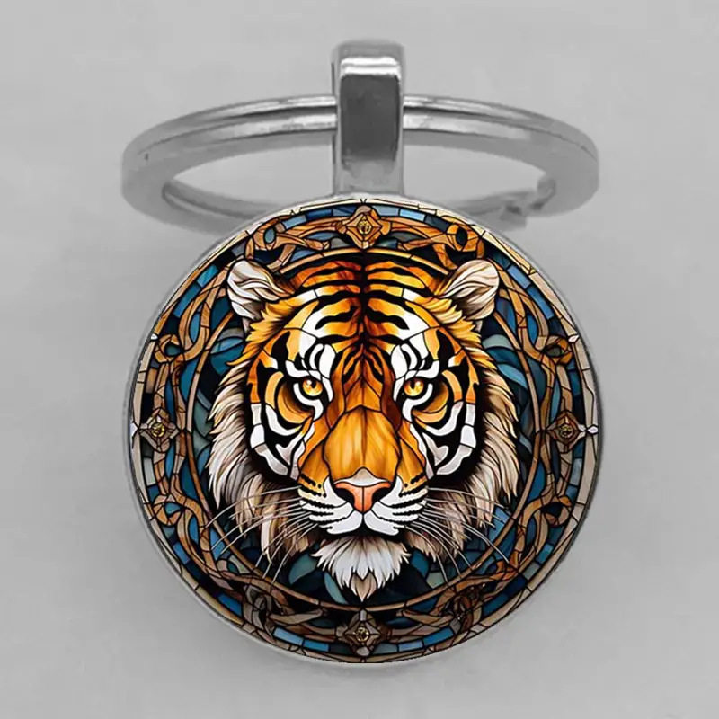 跨境新款 时尚个性虎头像图案 圆形玻璃吊坠钥匙扣创意小礼物礼品