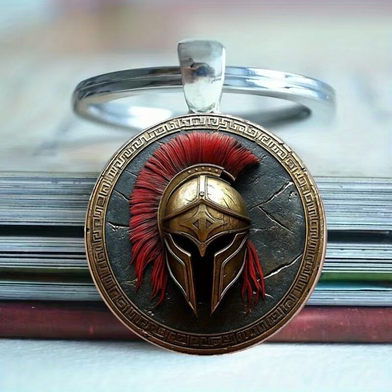 跨境新款时尚红金配色斯巴达头盔图案玻璃吊坠钥匙扣挂件挂饰礼物