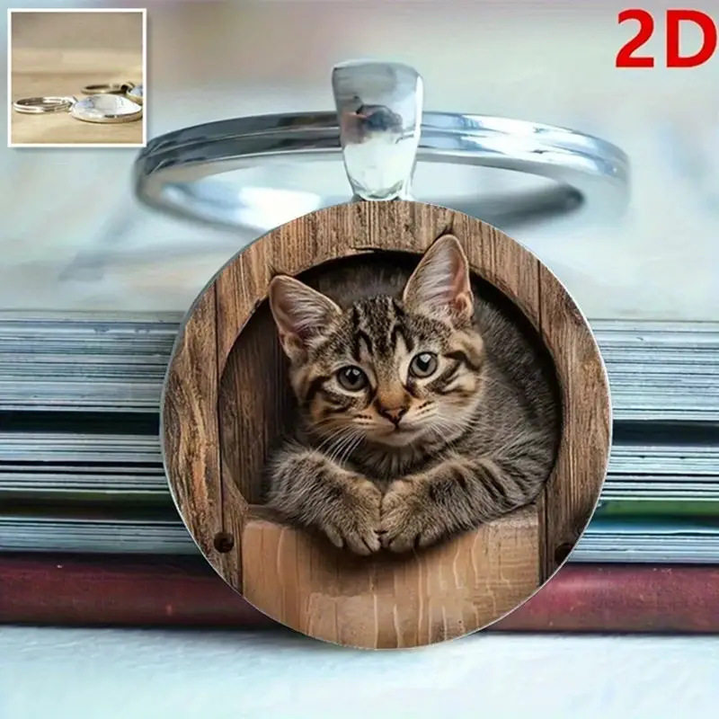 跨境新款复古可爱宠物虎斑猫钥匙扣合金玻璃吊坠钥匙扣小挂件配饰