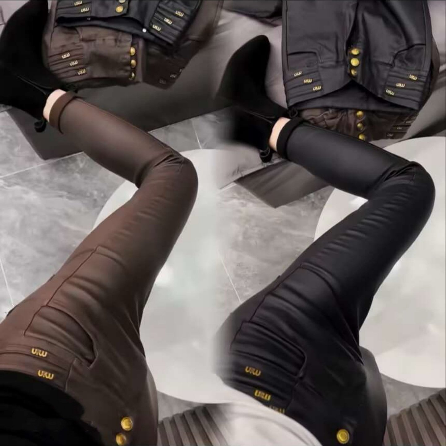 2025秋冬新款韩版百搭拉链装饰扣加绒显瘦小脚裤洋气女外穿仿皮裤