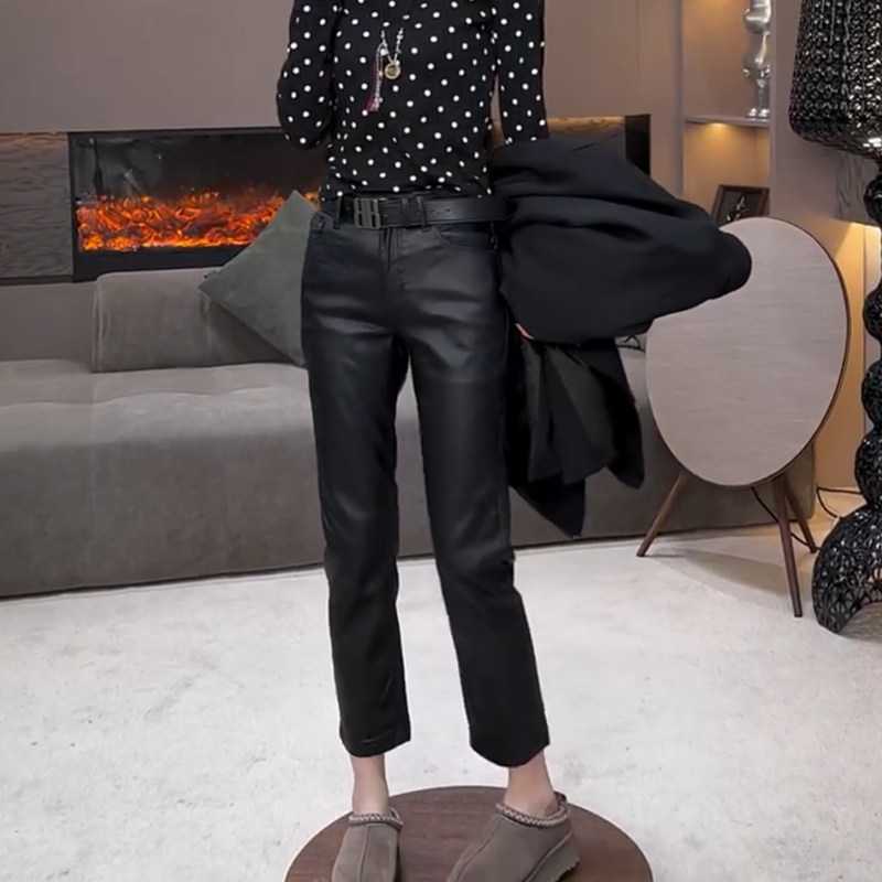 韩版2025秋冬气质涂层PU加绒皮裤显瘦休闲高腰纯色净版九分直筒裤