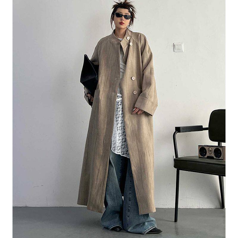 2024新款慵懒风新中式通勤显瘦休闲做旧廓形中长款过膝风衣外套女
