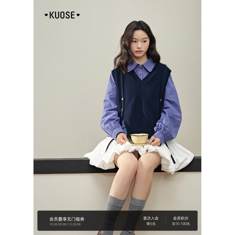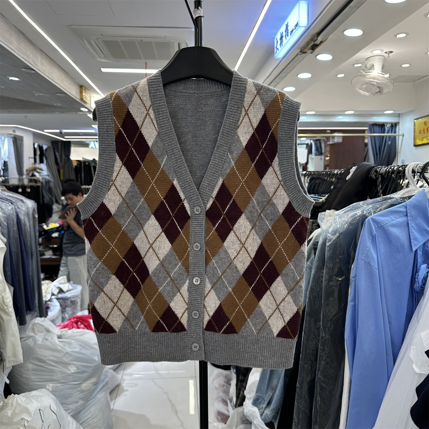 反季特HA去标秋冬新针织叠穿马甲女毛衣背心宽松格子坎肩上衣7651