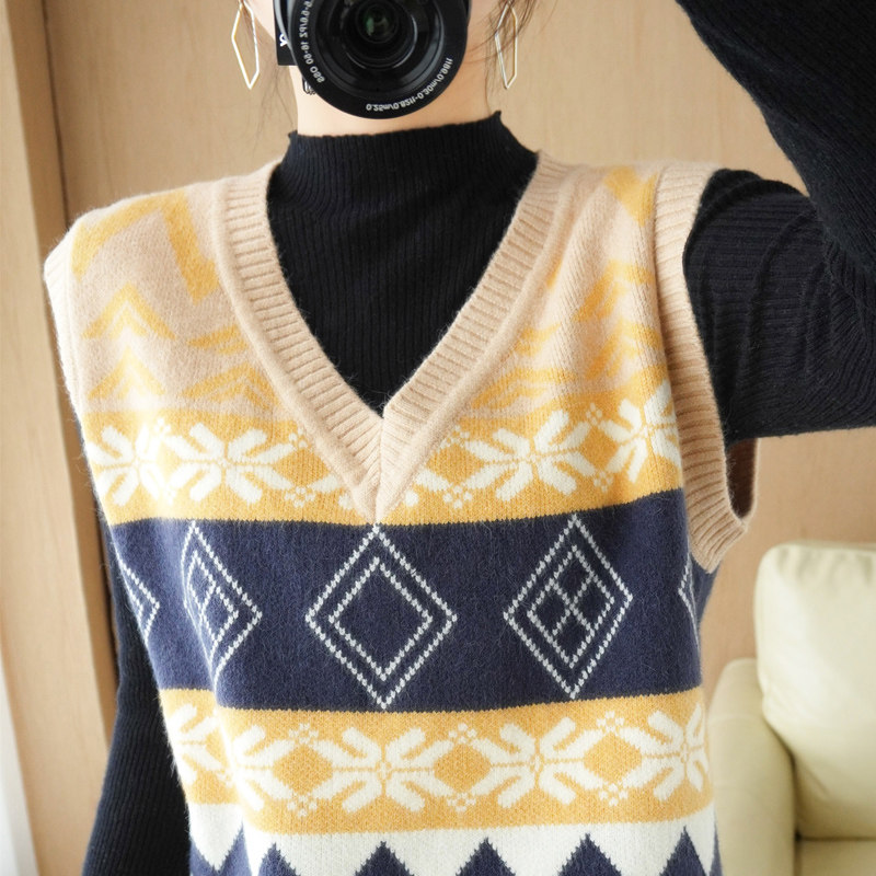 V领提花羊绒马甲女秋冬新款撞色无袖毛衣背心宽松针织外穿坎肩潮