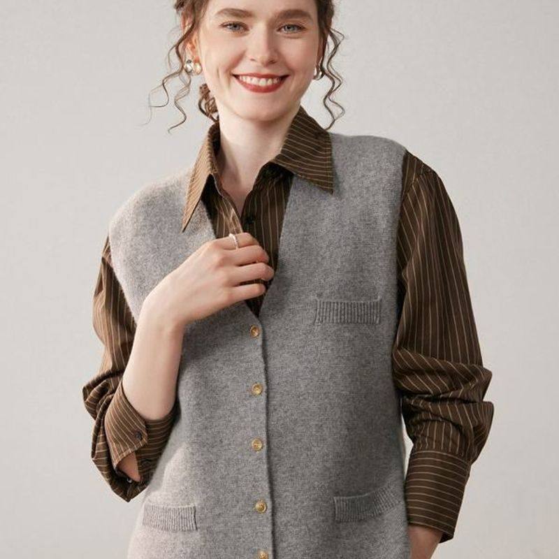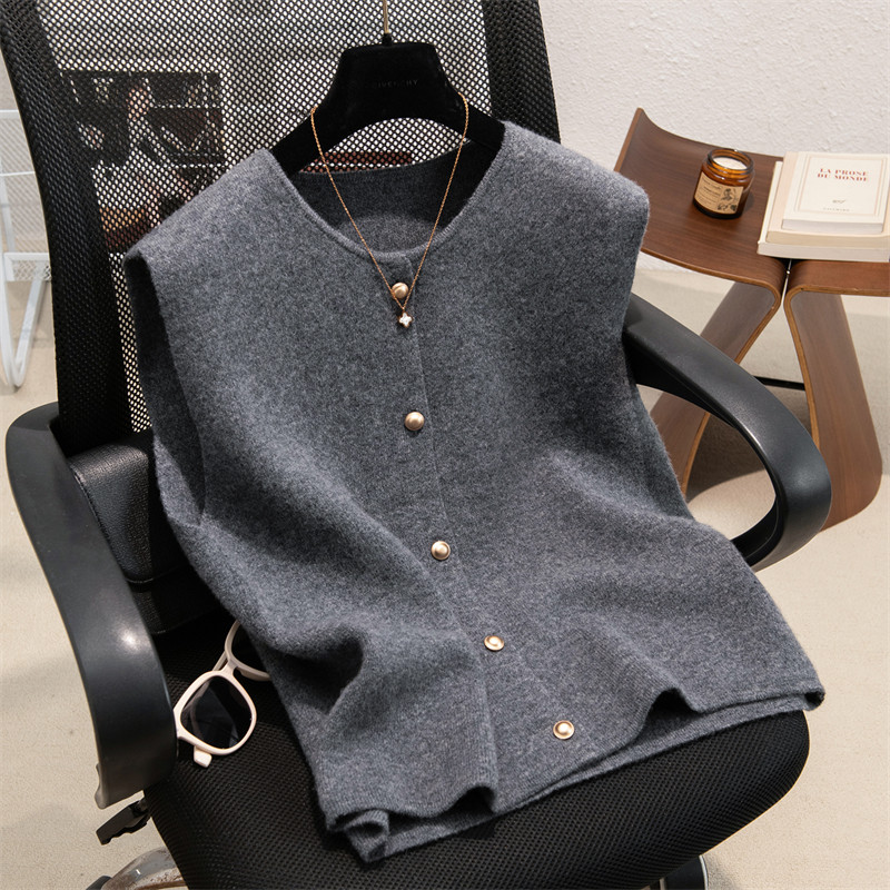 100%纯羊毛衫针织马甲开衫女圆领金属扣毛衣背心宽松叠穿羊绒坎肩