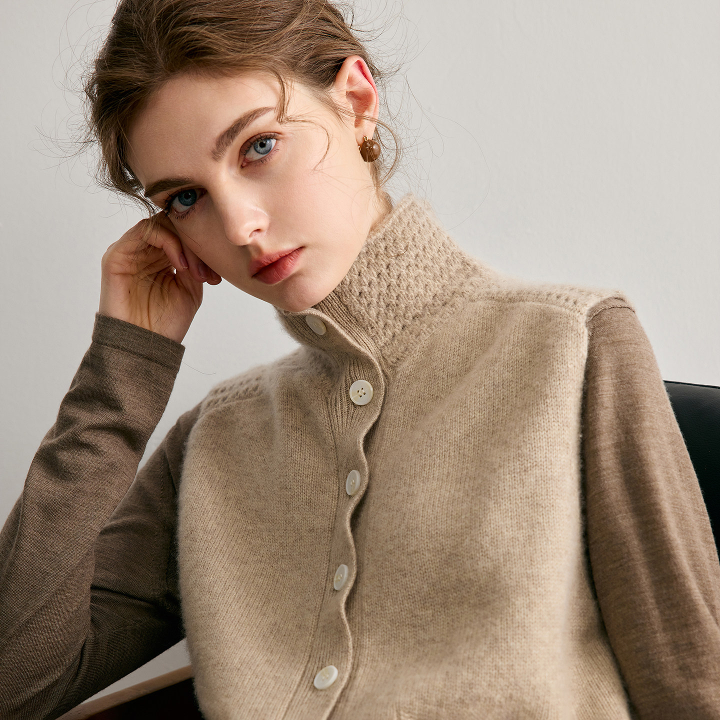 堆堆高领山羊绒衫针织马甲女纯色纽扣无袖毛衣背心宽松羊毛衫坎肩