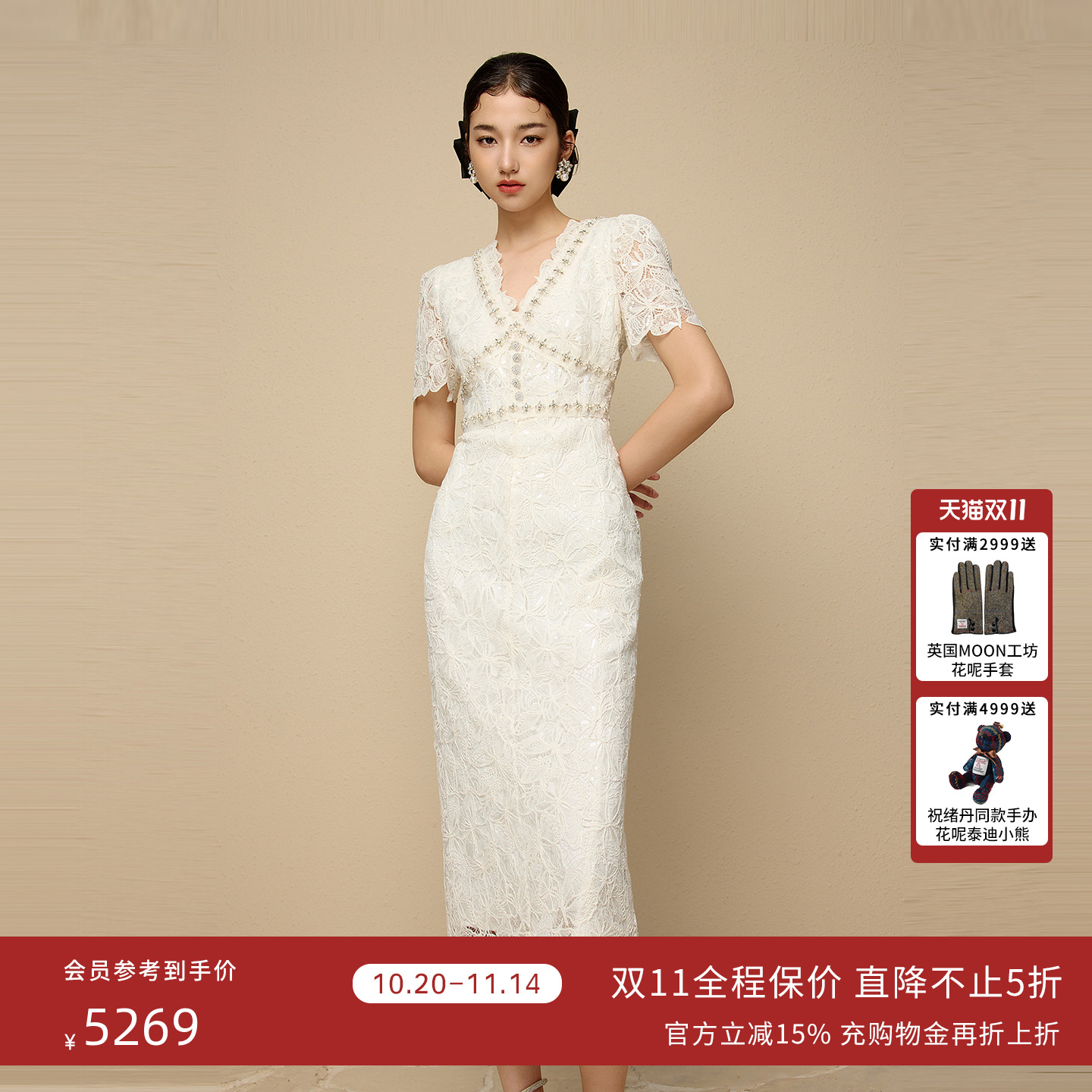 朗姿集团LIME莱茵优雅蕾丝连衣裙白色25夏花卉刺绣设计感礼服裙