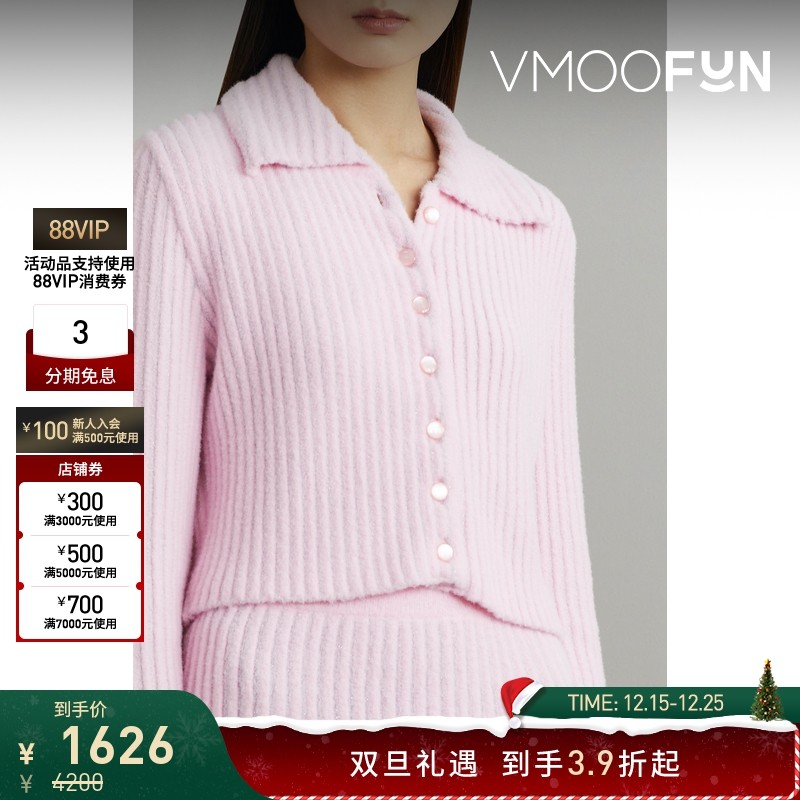 RECIT 粉色娃娃领含羊毛针织开衫女冬季小众设计感短款毛衣外套
