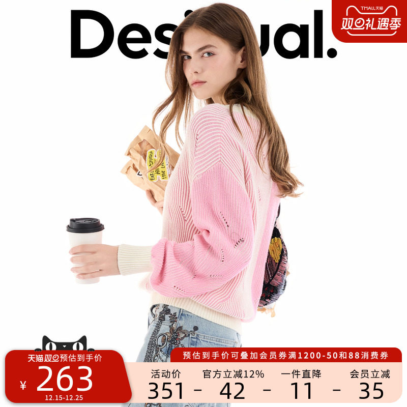Desigual25秋冬新品针织粉色坑条撞色设计长袖女式针织衫