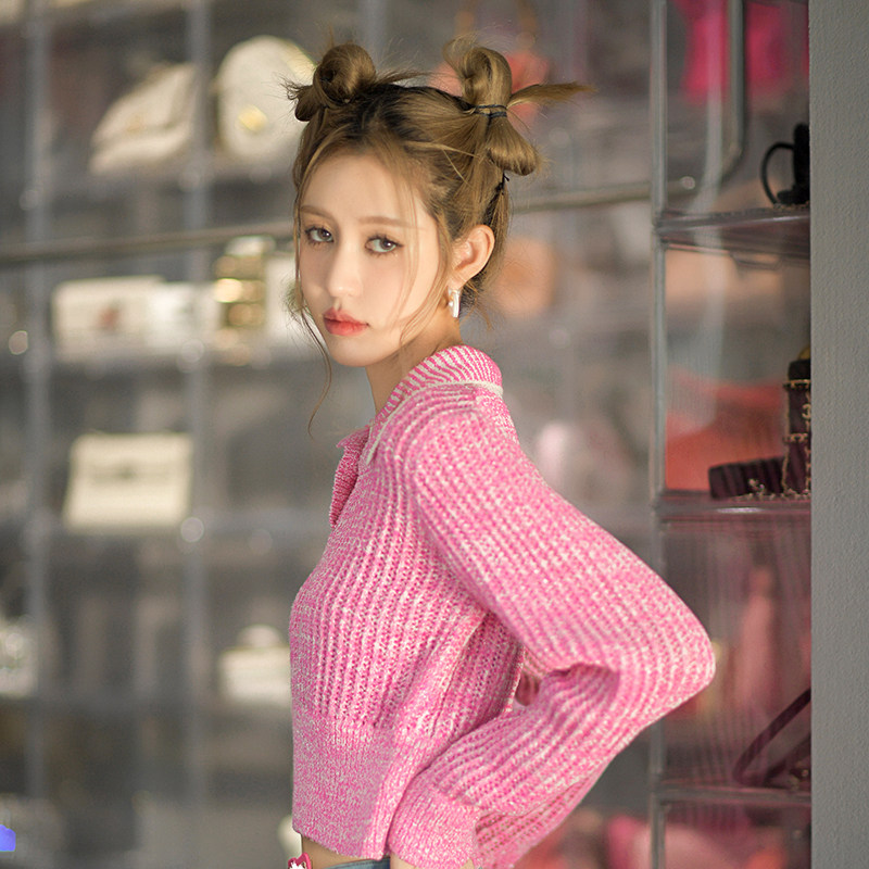 若语定制奶油小香 25B粉色小香可拆卸娃娃领针织开衫外套早秋上衣