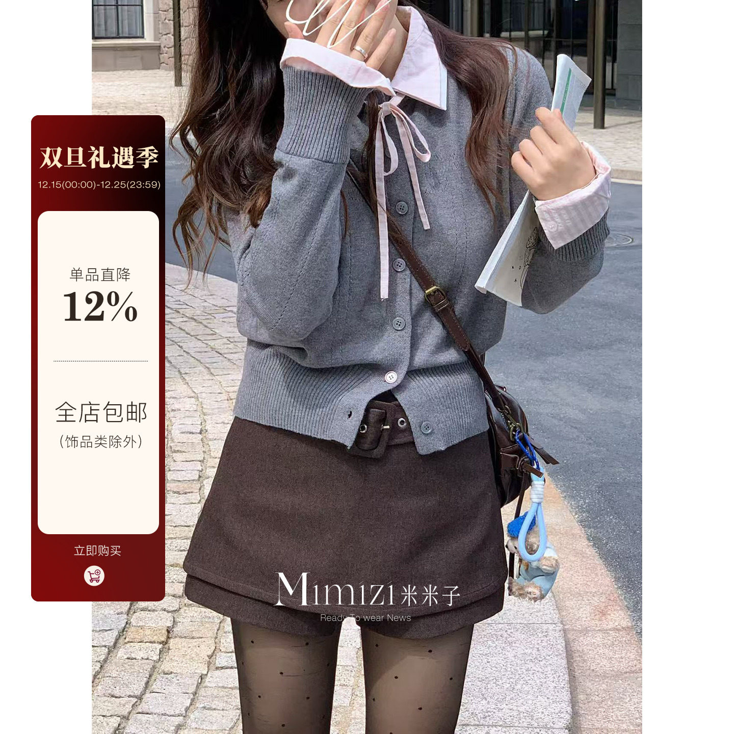 米米子微胖大码胖mm 学院风甜美灰色针织粉色领拼接假两件开衫冬