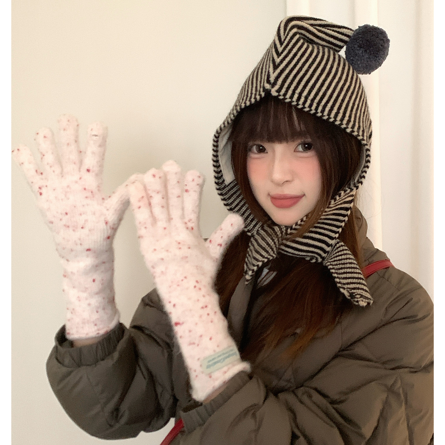 韩系氛围感彩点针织粉色手套女冬季可触屏分指外出骑行保暖防寒潮