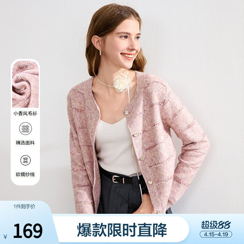 betu百图粉色小香风针织开衫女2026年春季新款薄款圆领毛衣外套