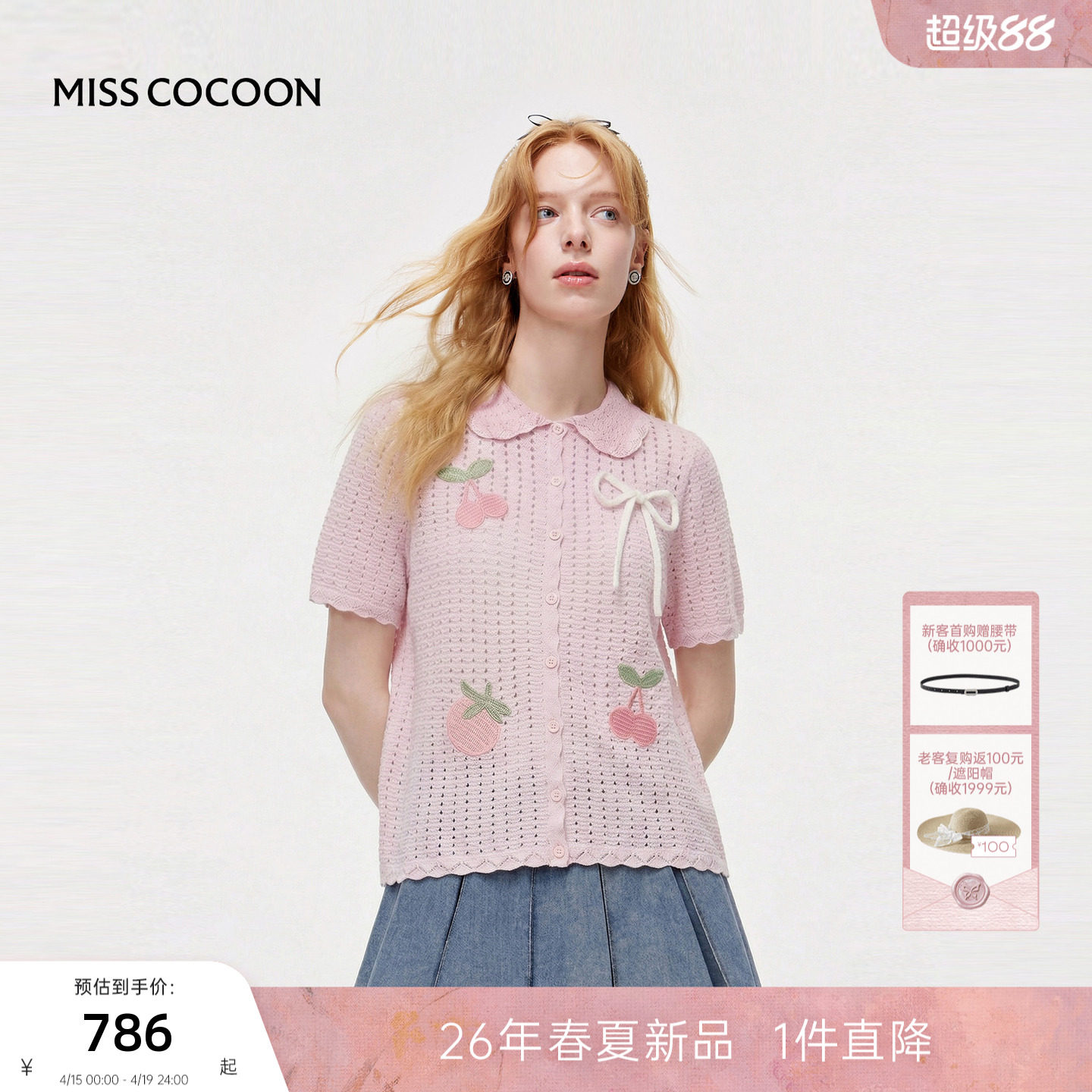MISSCOCOON可可尼娃娃领粉色开衫女2026夏新款短袖镂空毛针织衫