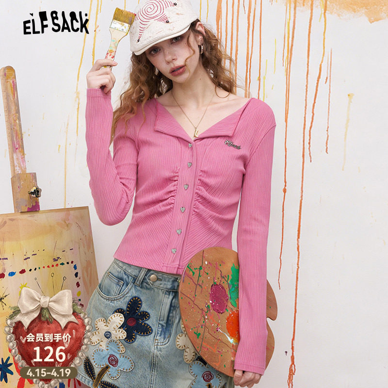 妖精的口袋粉色v领抽褶修身针织衫女2026早春新款显瘦内搭打底衫